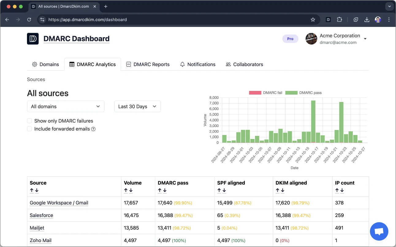 While it may not boast the extensive array of advanced features found in more enterprise-focused solutions, DMARCDKIM.com covers the fundamentals effectively. It's designed to give you a clear overview of your email traffic, helping you quickly identify DMARC compliance issues and take necessary actions.